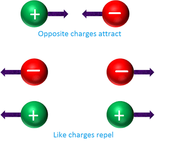 The physics of electricity starts with electric charge, a property of matter that’s either positive or negative and has a magnitude measured in Coulombs. The interaction of charges is governed by a simple rule: like charges repel, and opposites attract. This force is incredibly strong up close but weakens dramatically with distance, in accordance with the inverse-square law (if you double the distance between two charges, the force between them drops to a quarter of the original). The force is also proportional to the magnitudes of the charges interacting, and is mathematically summarized by Coulomb’s law.