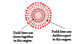 Another visual tool for representing electric fields are field lines, which show the direction a positive test charge would move if placed in the field, with arrows to indicate direction, and density of lines in some area correlating to the relative strength of the field at that location.