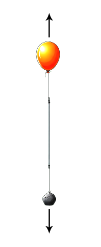 Imagine a curious object: the “floating lever”, a lightweight rod with a helium balloon tied to one end, pulling upward strongly, and a small rock at the other, weighing just enough to cancel the balloon’s buoyant force. This rod is perfectly balanced; the upward force on the balloon is exactly balanced by the downward force of the rock, so the lever experiences no net vertical force. If you let go of it in the air, it neither rises nor sinks. It simply hovers.