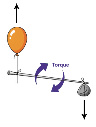 Now, consider it in Earth’s gravitational field. Despite the opposing forces being balanced, because they act at different ends, the lever experiences a rotational force, or torque. Hold it horizontally and let go: it immediately rotates, eventually aligning vertically with the gravitational field — balloon up, rock down; its most stable orientation.