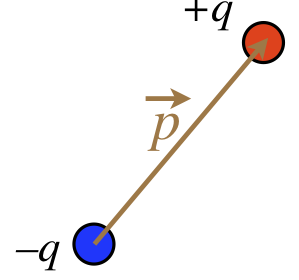 Dipoles have an important property called the dipole moment. For every dipole, its “moment” is a vector that points from the negative charge to the positive charge. Its magnitude represents the dipole’s strength, increasing with both the size of the charges and the distance separating them.