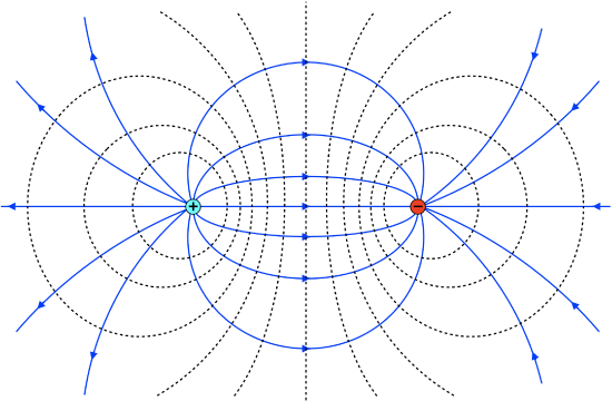 Visualization of an electric field generated by a dipole, showing both field lines (blue lines with arrows) and equipotential lines (dashed lines).