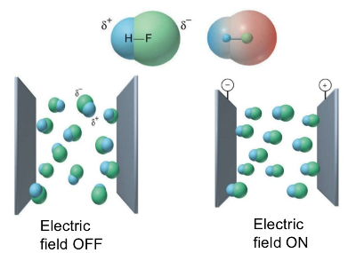 A diagram depicting how unaligned hydrogen fluoride ions (dipoles) will align to an electric field when it’s turned on.