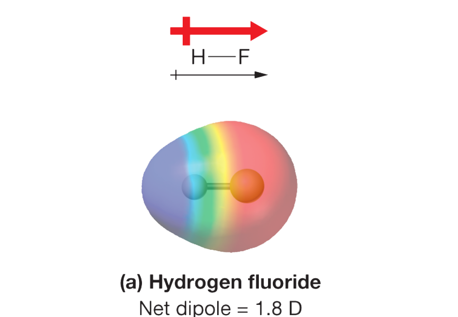 Hydrogen fluoride is a polar molecule because of a greater electron density (negative charge) at the fluoride ion and lower electron density (positive charge) at the hydrogen ion. The separation is the length of the bond between them. The dipole moment is drawn with a red arrow (note: for some reason, in chemistry, the convention is reversed, and they draw their dipoles pointing from positive to negative charge).