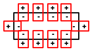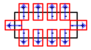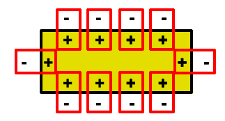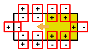 The inside of a cardiac cell is negative charged and the outside is positively charged, due to the function of several ion pumps and channels. The cell membrane, shown here on the left as a crude rectangle, can be thought of as a series of small dipoles. Each dipole is outlined in red in the diagrams below, with its dipole moment shown as a blue arrow. In this stable, resting state, the dipole moments more or less cancel each other out; there are arrows pointing in all directions, so no overall “net direction” emerges.