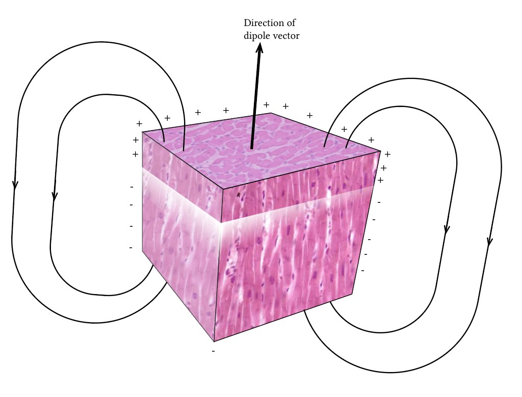 When we zoom in on a group of myocardial cells, as shown in the diagram below of the tissue cube, the cells in the depolarization wavefront (those actively depolarizing) generate a net dipole moment in the direction of the wave. Since you know that dipole moments generate an electric field based on their direction and strength, the movement of this wavefront creates an electric field in the tissue.