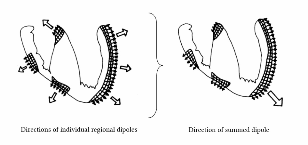 Depolarization wavefronts occurring simultaneously in different regions of the heart each generate a regional dipole, with different magnitudes and directions. Then by considering the cumulative effect of all these regional dipoles, you can extrapolate a single net cardiac dipole moment which represents the heart’s overall electrical activity at any given instant.