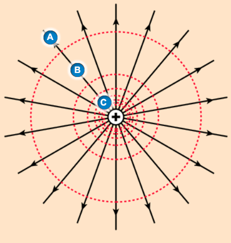 Another key idea is that the farther you are from the source of an electric field, the weaker the force becomes, and with a weaker force less energy is required to move a charge. For example, in the field depicted to the left, moving a charge from A to B requires less work than moving the same charge from B to C, even though the distances traversed by the charge are identical.