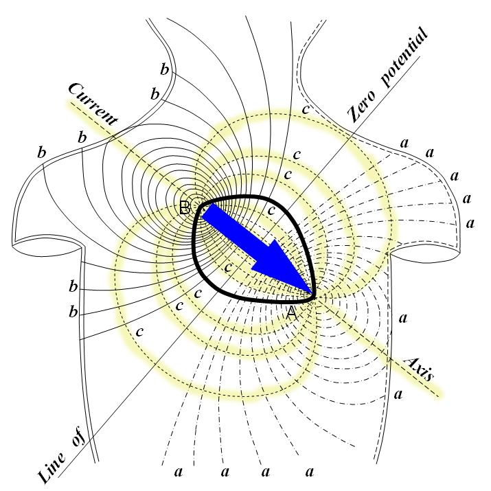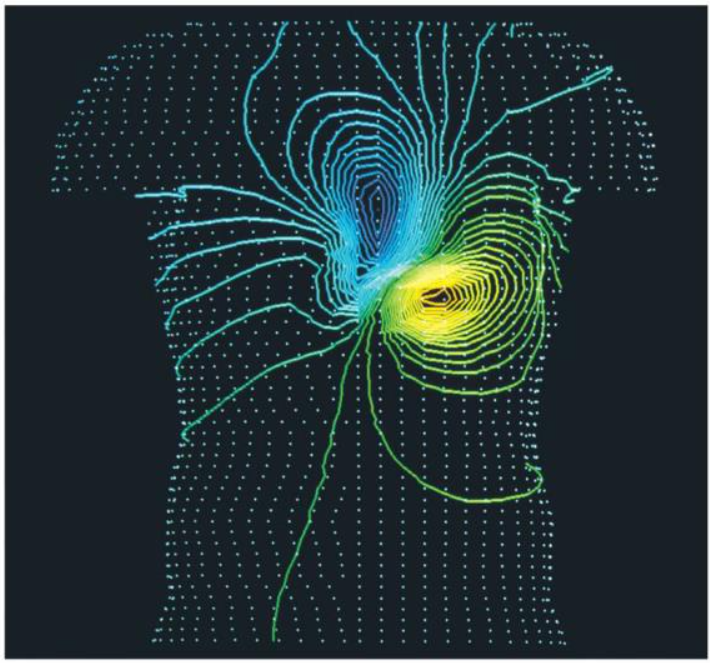 Notice how the electric field and its equipotential lines extend out across the skin, much further than the borders of the heart. The diagram you’re looking at is an idealized mathematical analogue of the heart, with perfect field lines. However, a real heart’s electrical field is not a perfect dipole, but a distorted one. The diagram below shows a more realistic model of the heart’s equipotential lines, which, despite being distorted, still resembles a recognizable version of an ideal dipole’s equipotential lines. This is all to say that the ECG is an approximation of the heart’s electrical activity, not a perfect reality.