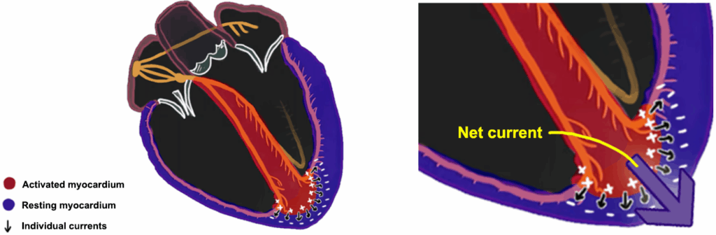 Electrical signals “activate” the heart muscle and cause this muscle to contract. Electrical signals spread from areas of activated heart muscle to resting heart muscle. You can think of this as individual currents going in multiple directions (black arrows), or the “net current” (purple arrow) that is the sum effect of these individual currents.